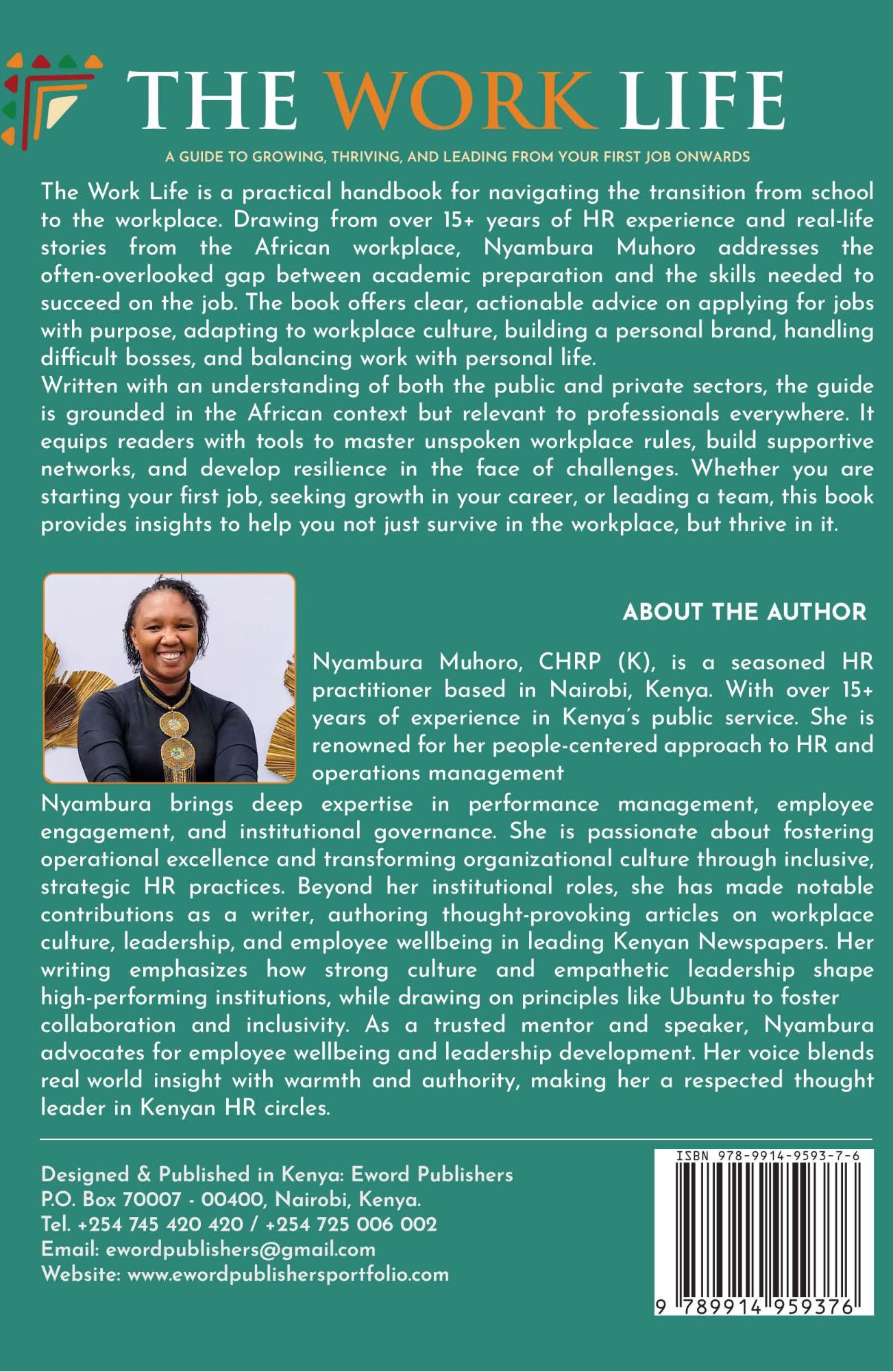 The Work Life is a practical handbook for navigating the transition from school to the workplace. Drawing from over 15+ years of HR experience and real-life stories from the African workplace, Nyambura Muhoro addresses the often-overlooked gap between academic preparation and the skills needed to succeed on the job. The book ofers clear, actionable advice on applying for jobs with purpose, adapting to workplace culture, building a personal brand, handling difficult bosses, and balancing work with personal life.